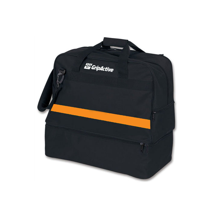This sleek black football player kit bag with a standout orange strip is built for serious players. It features two large compartments for separating clean and dirty gear, plus a side and front pocket for easy access to essentials. Designed with both a short handle and long shoulder strap, it offers flexible carrying options. With durable zippers and premium material, it’s a reliable and stylish choice for bags for football players across all levels.