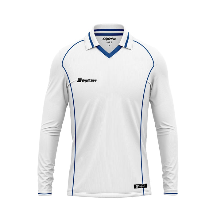 Our Full Sleeve white jersey combines warmth and breathability for UK players. Perfect for early morning or evening games. Unisex sizing for all team members. Coloured lined stripe across the chest gives a bold, professional look. Custom name and Grip Active logo included. Get your full cricket kit now!